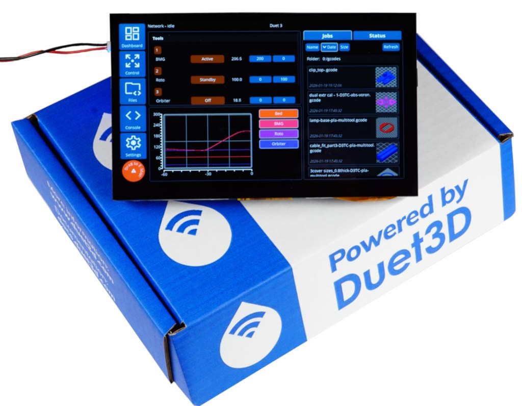 The Duet3D DuetScreen is a family of colour touch screen controllers for Duet 2 and Duet 3 based machines. It is also compatible with other Controllers running RepRapFirmware.
